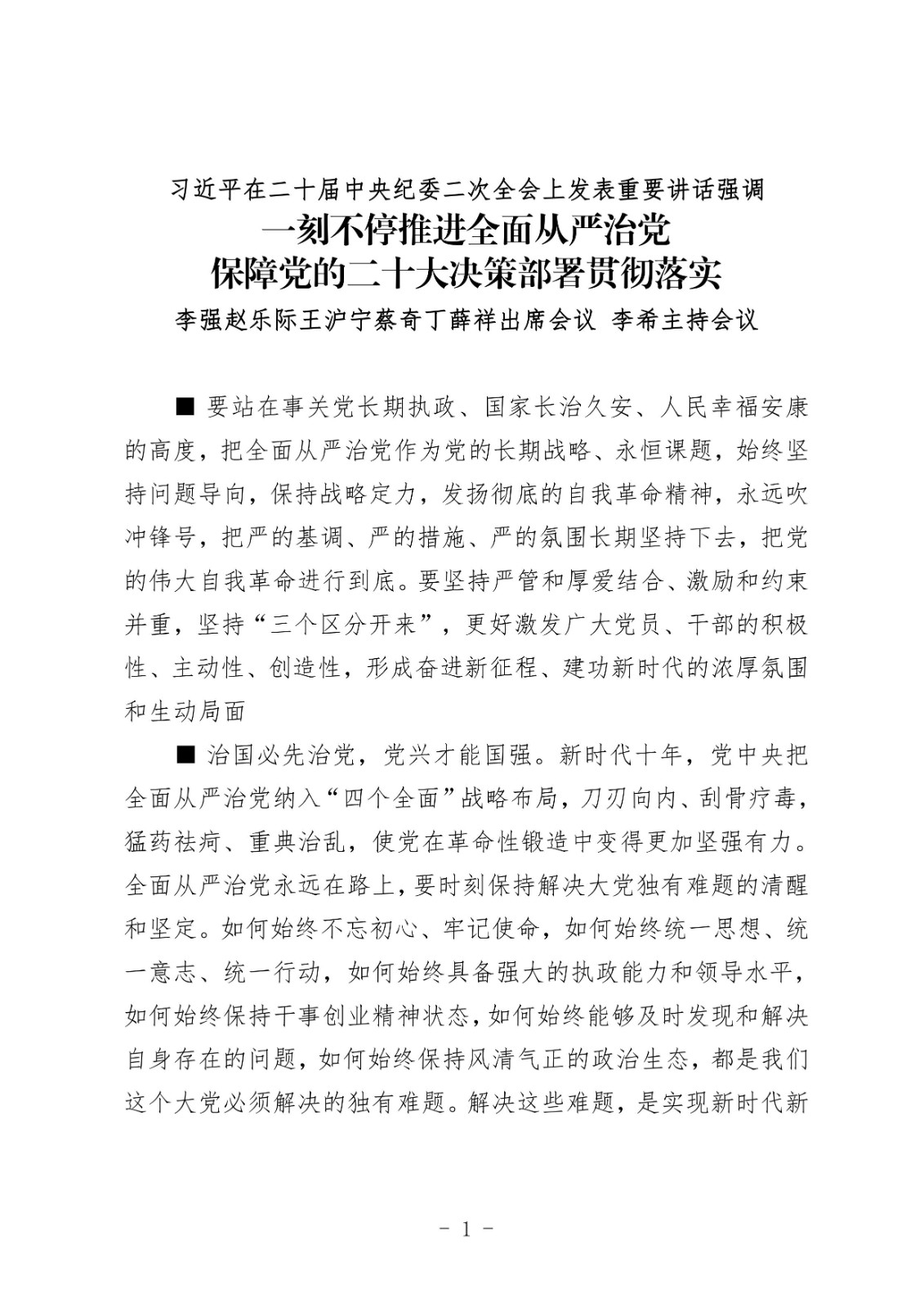 习近平在二十届中央纪委二次全会上发表重要讲话强调一刻不停推进全面从严治党保障党的二十大决策部署贯彻落实