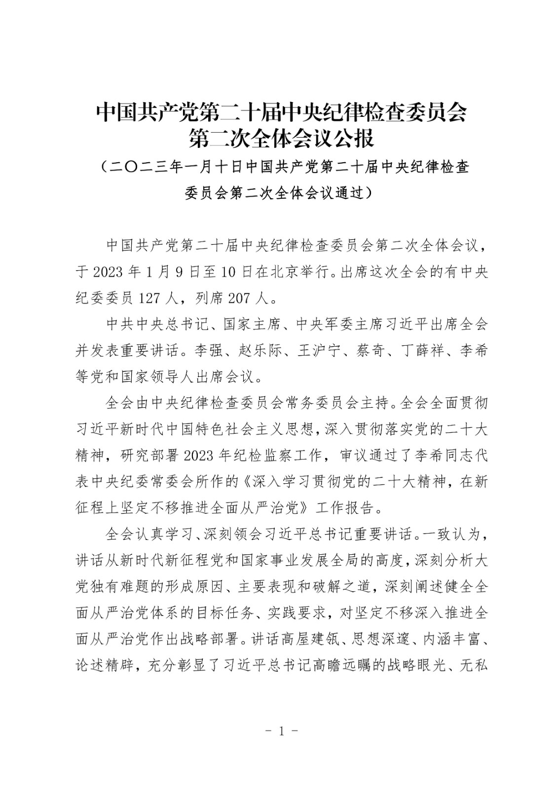 中国共产党第二十届中央纪律检查委员会第二次全体会议公报