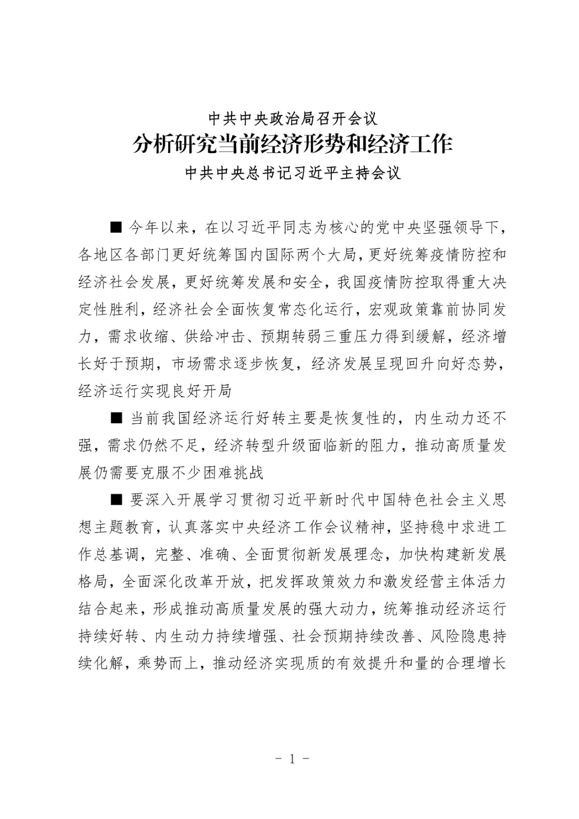 中共中央政治局召开会议分析研究当前经济形势和经济工作